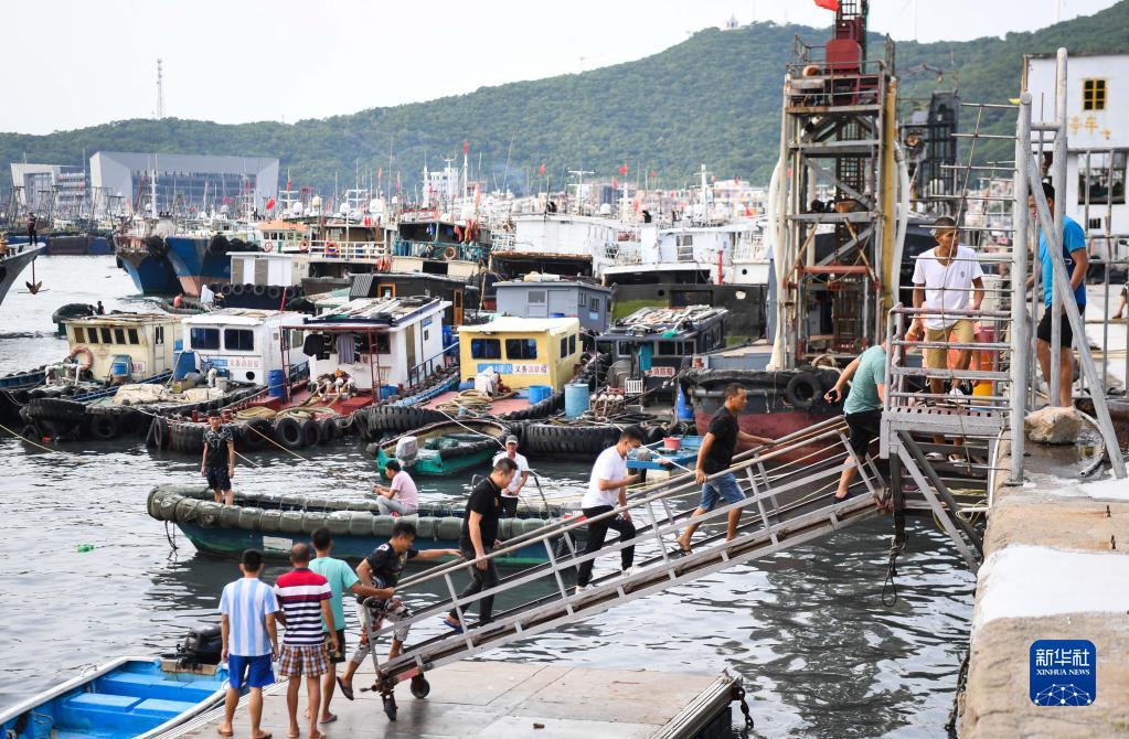 8月24日,在廣東陽(yáng)江市海陵島閘坡國家級中心漁港,海上從業(yè)人員上岸避風(fēng)。