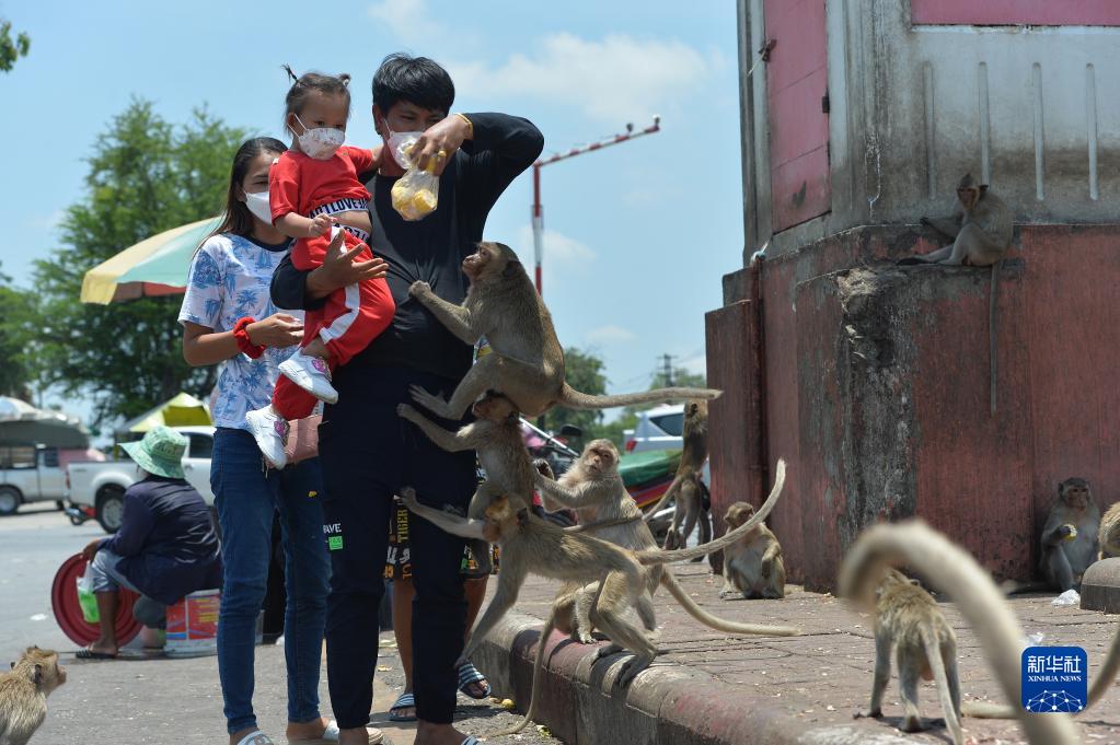 8月24日,游客在泰國華富里府投喂猴子。