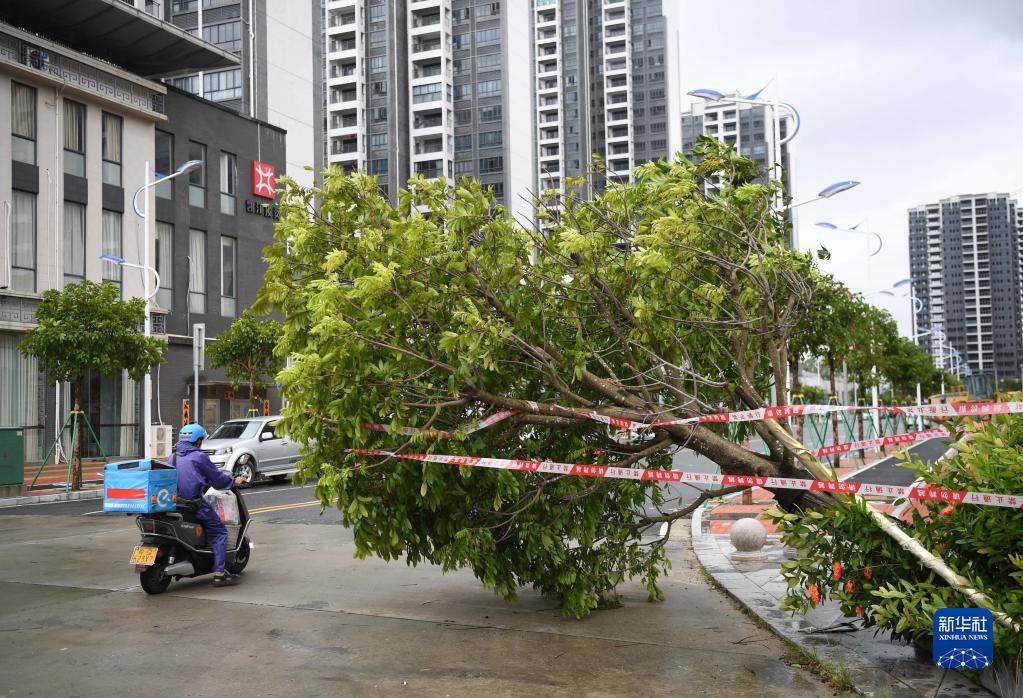 8月25日,在廣東陽(yáng)江市石灣路路口,快遞員從倒伏的樹(shù)木旁駛過(guò)。