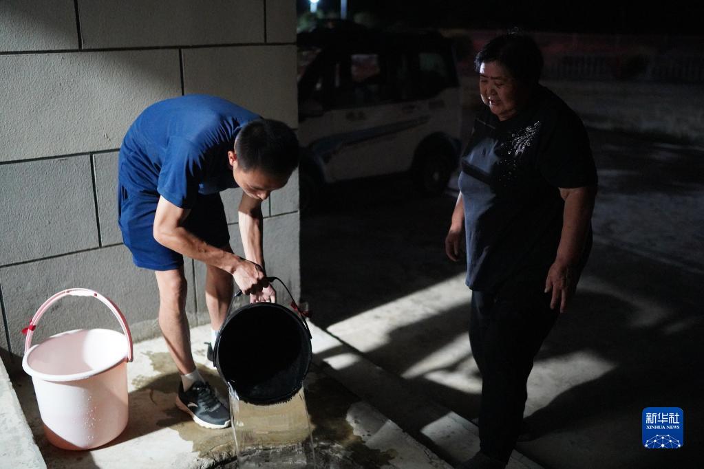 在瑞昌市范鎮上源村,消防員傅康(左)幫一名老人提水回家(8月23日攝)。