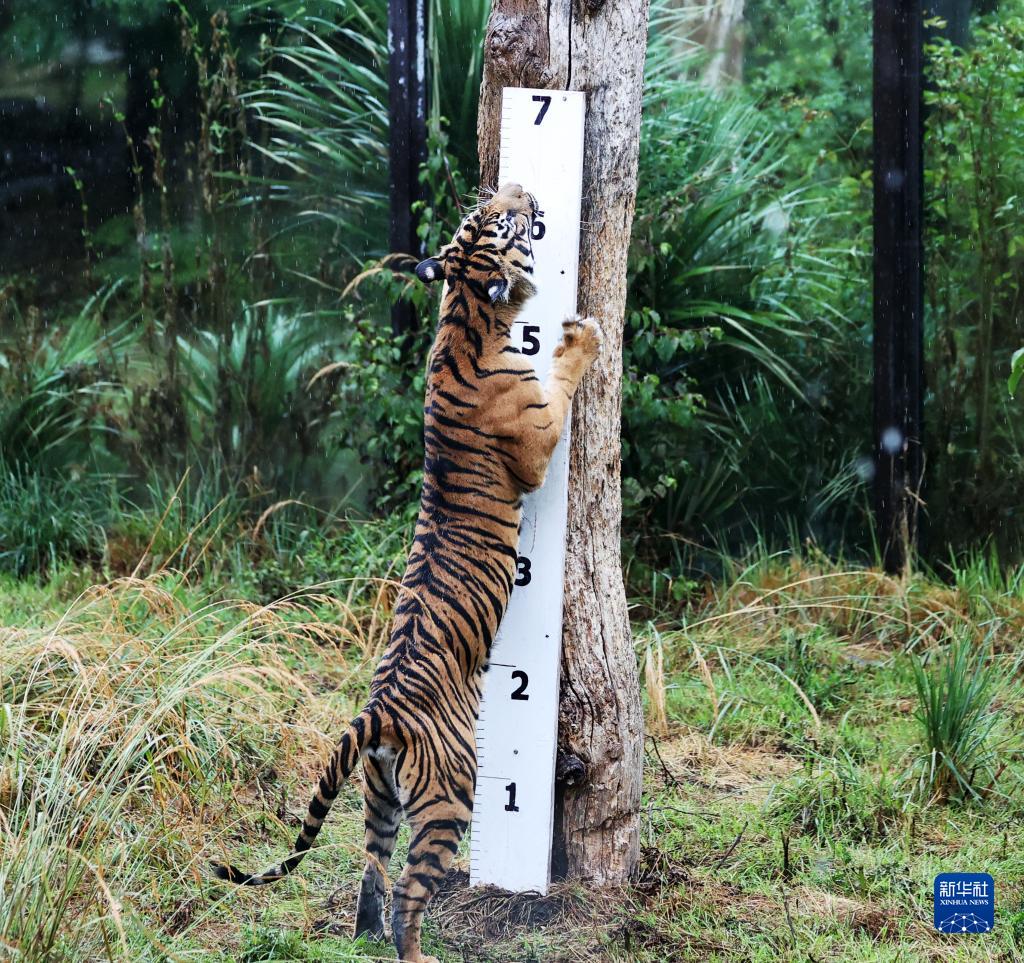 8月25日,在英國倫敦動(dòng)物園,一只蘇門(mén)答臘虎爬上身高標尺。