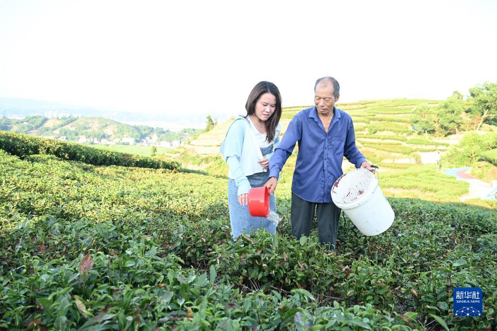 8月25日,植保技術(shù)服務(wù)人員林玲靚(左)在福鼎市點(diǎn)頭鎮江美村一處茶園指導茶農利用天然源生物激活劑等開(kāi)展茶樹(shù)旱熱害修復處理。