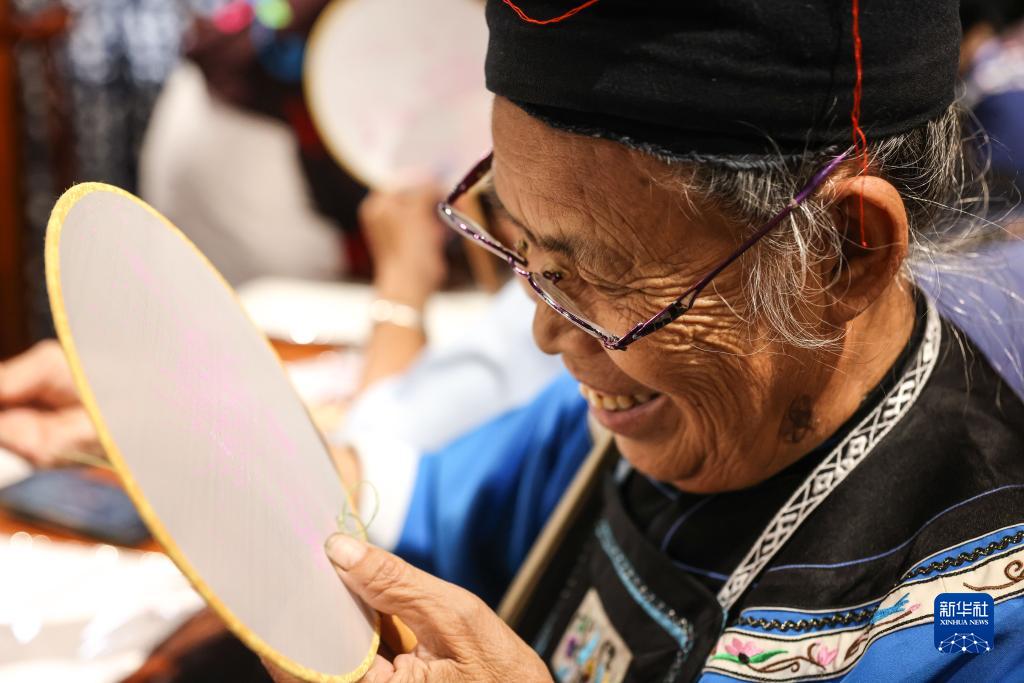 8月26日,貴陽(yáng)市花溪區青巖鎮山王廟村婦女在刺繡扇面。