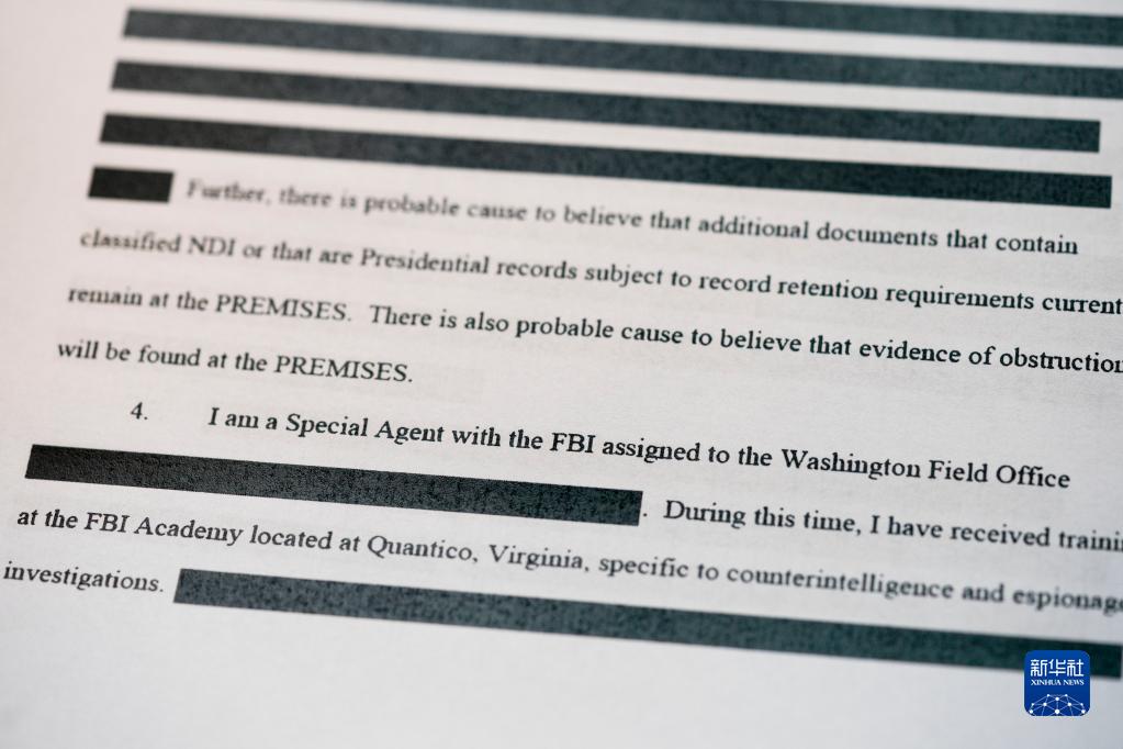 這是8月26日拍攝的美國聯(lián)邦調查局申請搜查前總統特朗普住所海湖莊園時(shí)向法院提交書(shū)面證詞的部分內容。