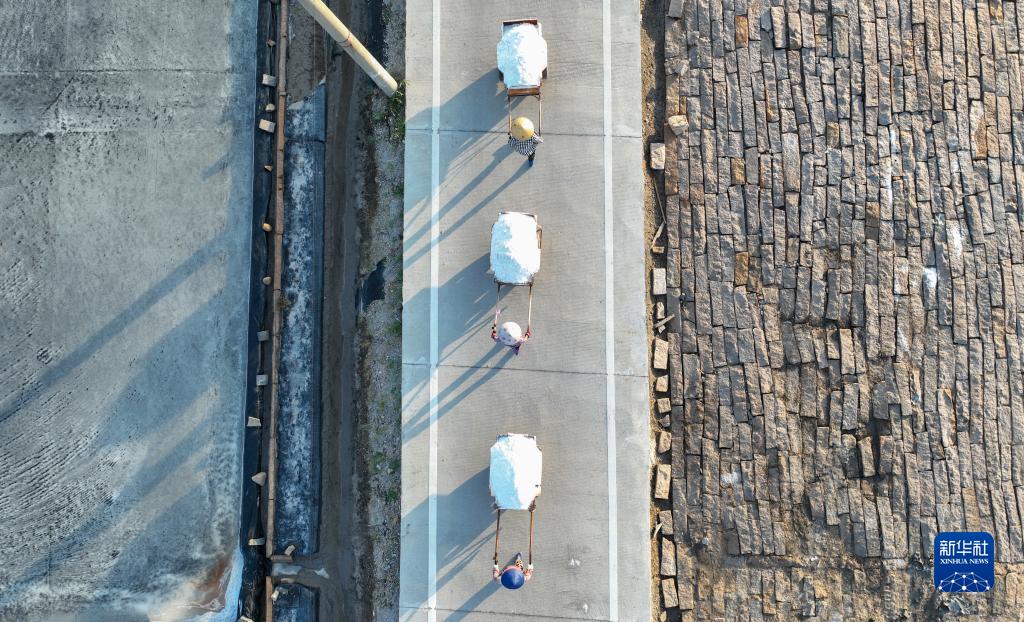 8月26日,在福建省莆田市秀嶼區東嶠鎮的莆田鹽場(chǎng),工人們在運輸海鹽(無(wú)人機照片)。