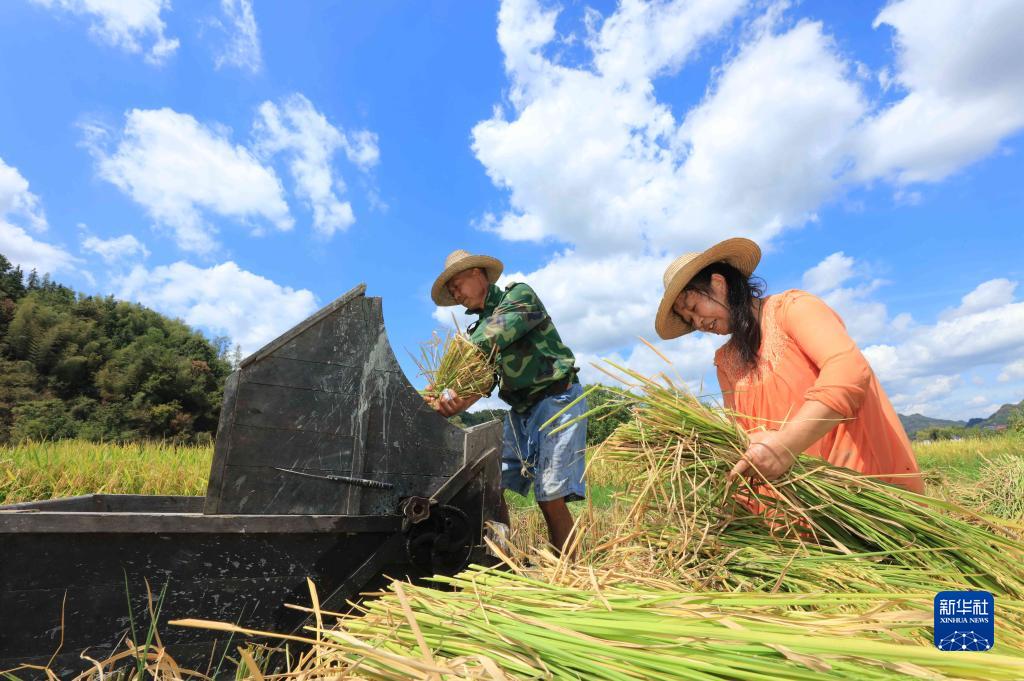 連日來(lái),湖南張家界市永定區合作橋鄉種植的水稻進(jìn)入成熟收割期,當地農民加緊收割,確保顆粒歸倉。