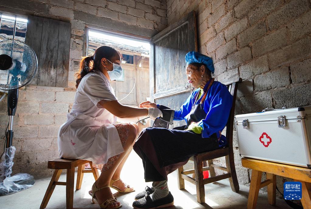 8月19日,鄉村醫生吳明英在貴州省黔東南苗族侗族自治州丹寨縣興仁鎮城望村為村民測量血壓。