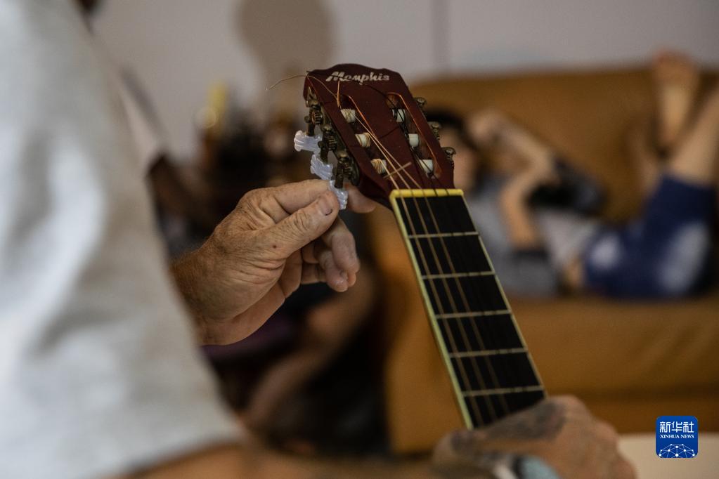 8月25日,在巴西里約熱內盧西區“上帝之城”社區,“彈奏聲音”項目負責人塞爾吉奧·弗雷塔斯在課堂上調試樂(lè )器。新華社記者 王天聰 攝