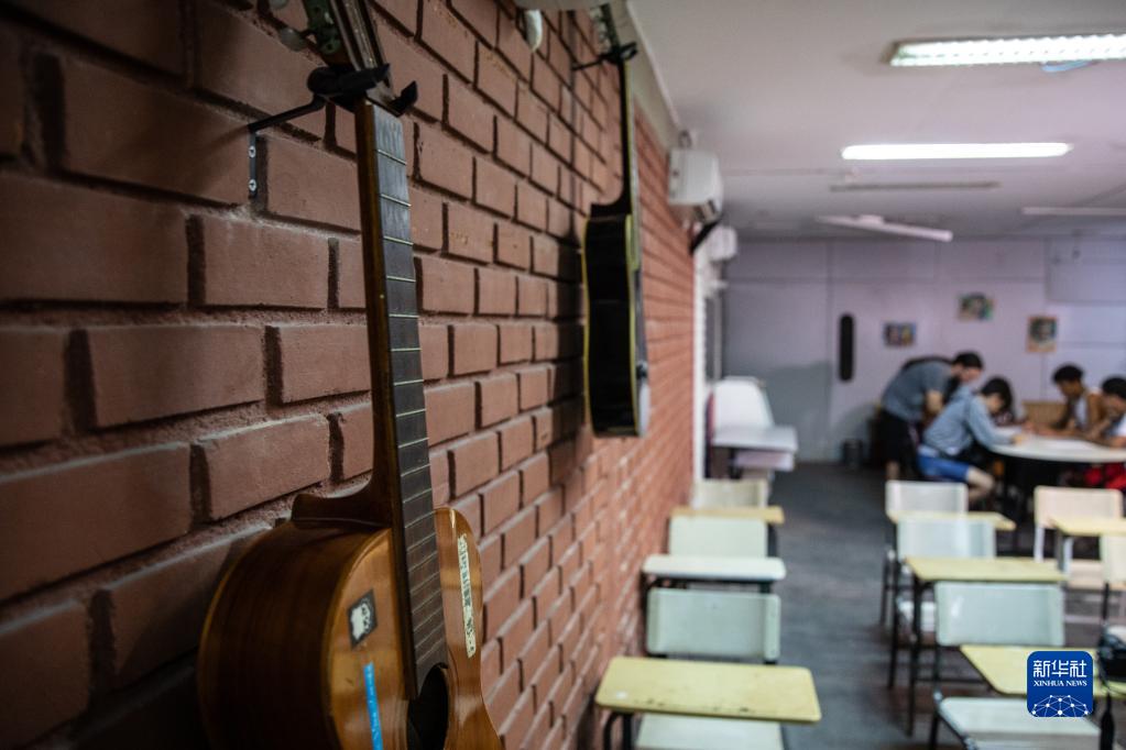 這是8月25日在巴西里約熱內盧西區“上帝之城”社區“彈奏聲音”教室拍攝的掛在墻上的樂(lè )器。新華社記者 王天聰 攝
