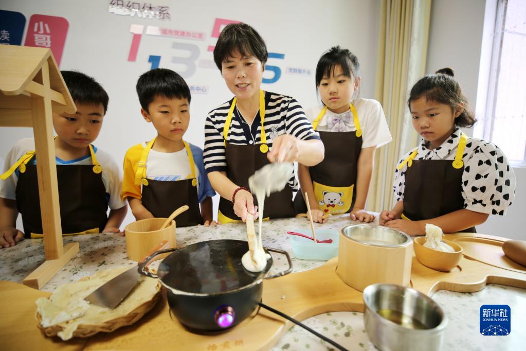8月27日,在山東省臨沂市郯城縣郯城街道龍泉社區黨群服務(wù)中心,社區居民教孩子們烙制傳統手工煎餅。