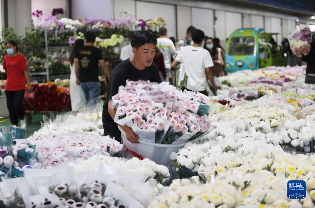 8月27日夜,昆明斗南花卉交易市場(chǎng)的商家在擺放鮮花。