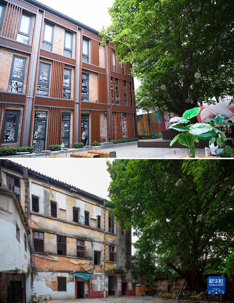 這是一張拼版照片:上圖為2022年7月19日拍攝的廣州永慶坊榕樹(shù)廣場(chǎng)(新華社記者 鄧華 攝);下圖為2015年拍攝的永慶坊榕樹(shù)廣場(chǎng)(廣州市荔灣區住房建設和園林局供圖)。