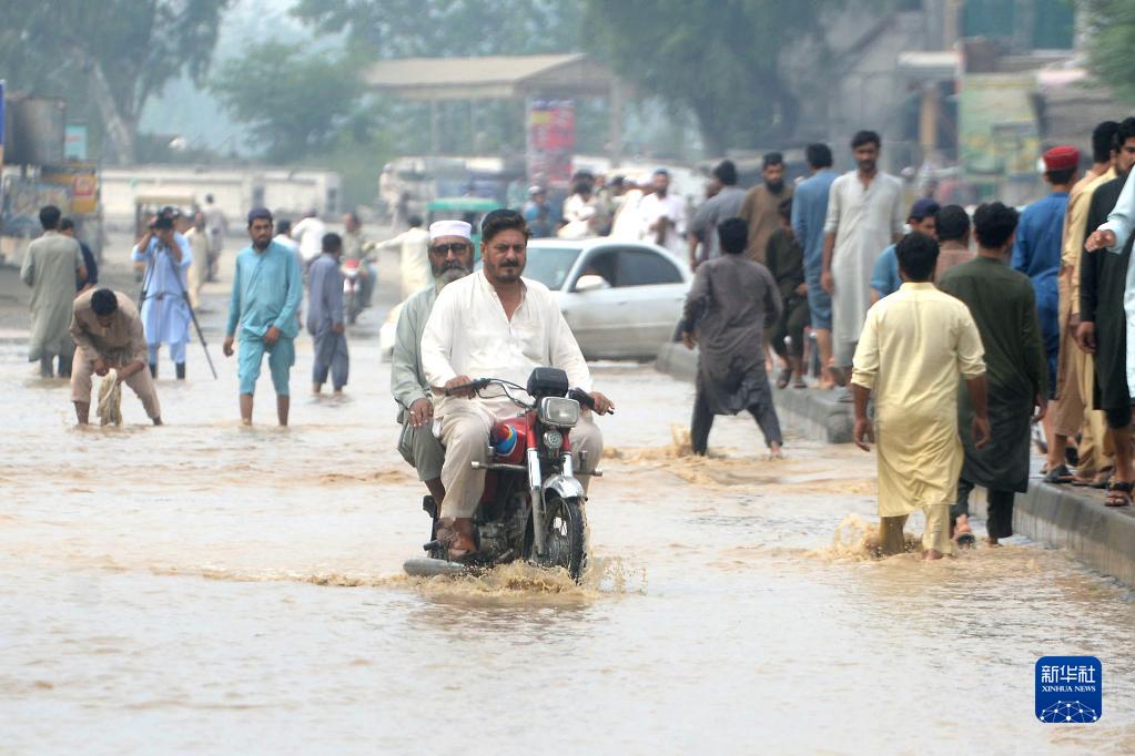 8月27日,人們在巴基斯坦賈爾瑟達涉水出行。