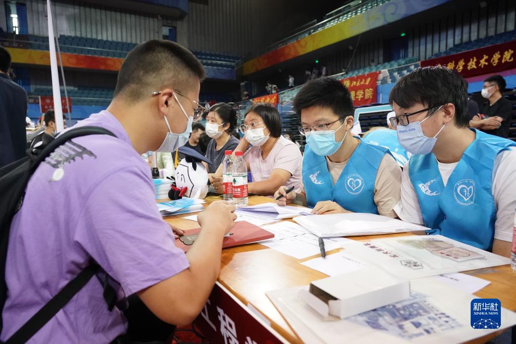 8月28日,在北京大學(xué)邱德拔體育館,一名北京大學(xué)化學(xué)與分子工程學(xué)院2022級本科新生(左一)在報到。