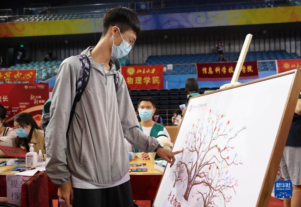 8月28日,在北京大學(xué)邱德拔體育館,一名北京大學(xué)物理學(xué)院2022級本科新生在學(xué)院入學(xué)“簽到樹(shù)”上按彩色手印。