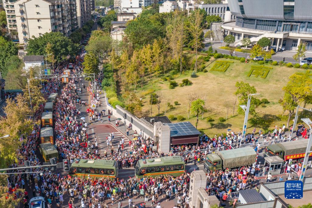 8月28日,在重慶市北碚區,群眾自發(fā)來(lái)到道路兩旁歡送森林消防隊員(無(wú)人機照片)。