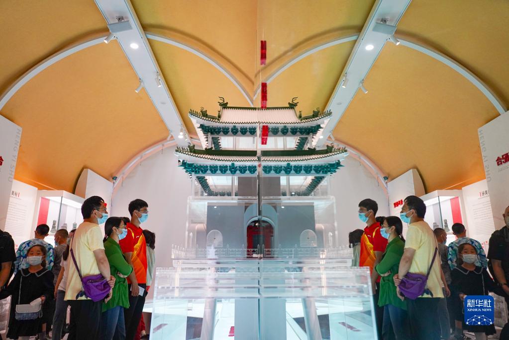 8月28日,觀(guān)眾觀(guān)看鏡像效果下的北京鐘樓模型。