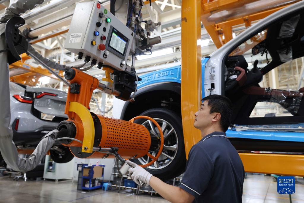 8月28日,在合肥經(jīng)濟技術(shù)開(kāi)發(fā)區的一家新能源汽車(chē)生產(chǎn)企業(yè),工人在整車(chē)生產(chǎn)線(xiàn)上作業(yè)。