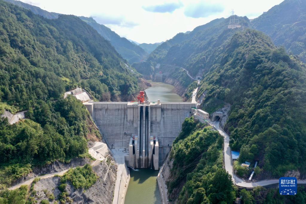 8月28日拍攝的福建周寧抽水蓄能電站下水庫108米碾壓混凝土重力壩(無(wú)人機照片)。