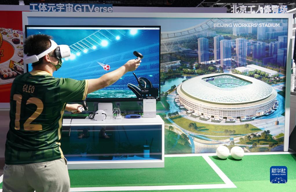 8月28日,在國家會(huì )議中心舉行的服貿會(huì )媒體探營(yíng)活動(dòng)中,一名高通公司的工作人員展示工體元宇宙GTVerse。