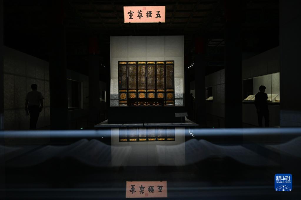 這是清乾隆帝楷書(shū)五經(jīng)萃室匾及炕桌、炕屏(8月29日攝)。