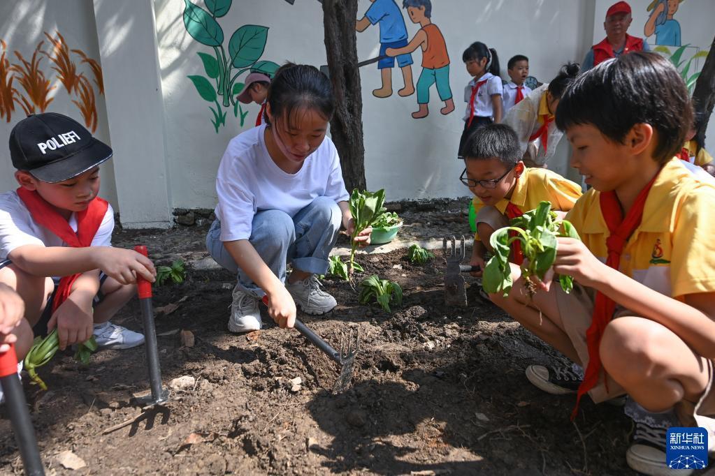 8月29日,龍泉小學(xué)老師帶領(lǐng)學(xué)生在校園里的“方圓農場(chǎng)”學(xué)習種菜。
