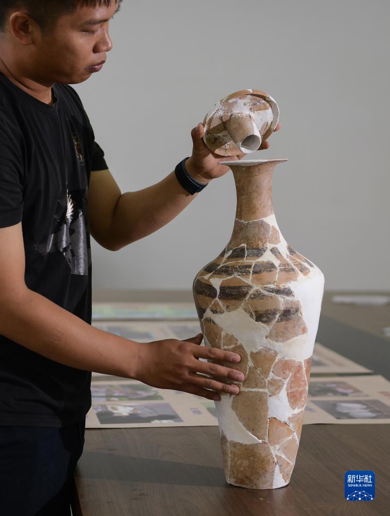 考古工作人員在展示南佐遺址內出土的帶有蓋塞的彩陶小口細頸平底瓶(8月25日攝)。
