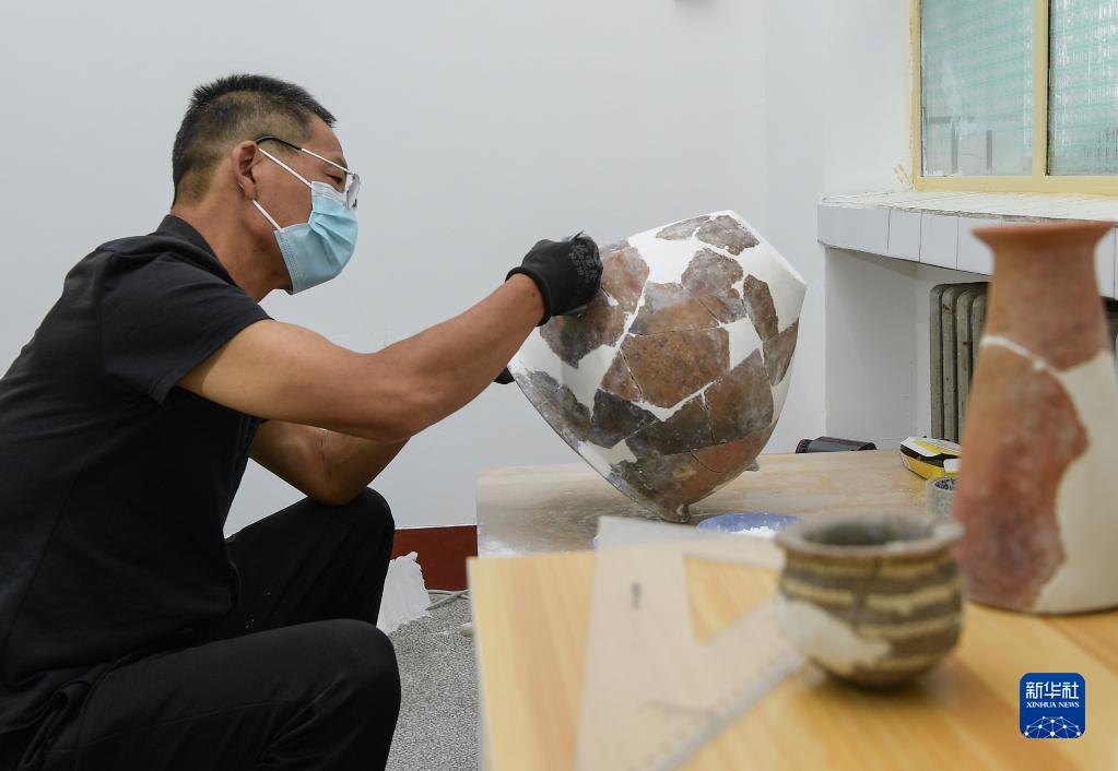文物工作者對南佐遺址內出土的陶器進(jìn)行修復(8月25日攝)。