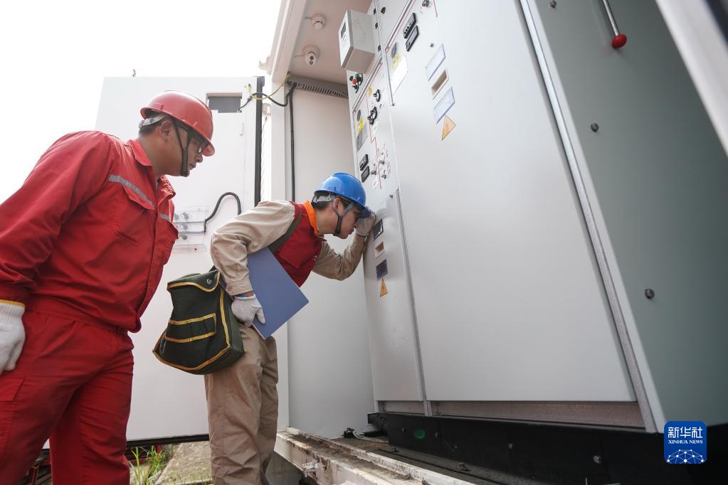 8月29日,在位于揚州市江都區的江蘇油田花頁(yè)5HF井電驅壓裂現場(chǎng),油田工作人員和電力工人在巡檢電力設備。