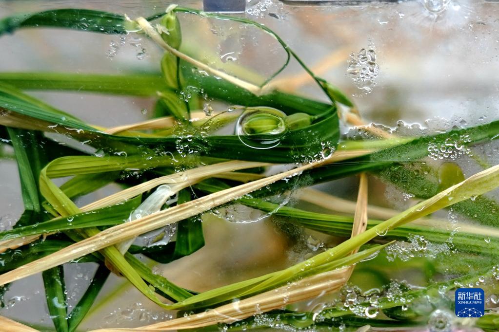 這是“太空同款”水稻培養單元中水稻生長(cháng)的稻穗。新華社記者 張建松 攝