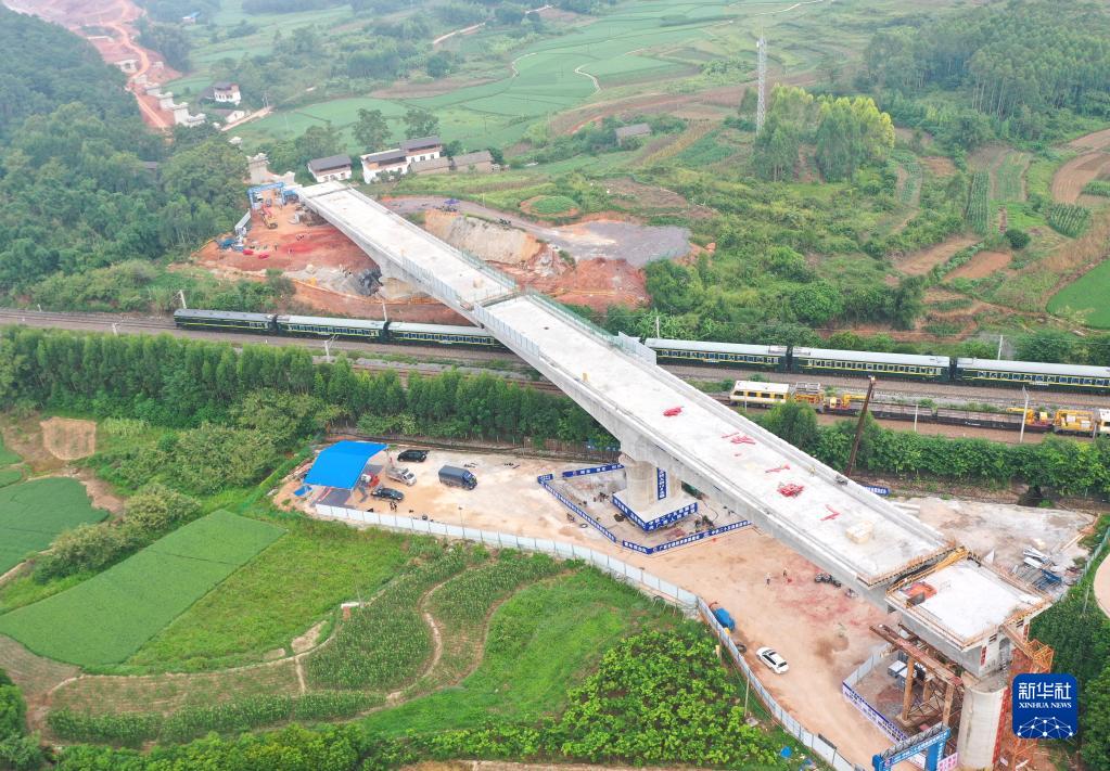8月30日,列車(chē)從剛剛轉體成功的廣西南玉鐵路福慶特大橋雙幅轉體橋下通過(guò)(無(wú)人機照片)。