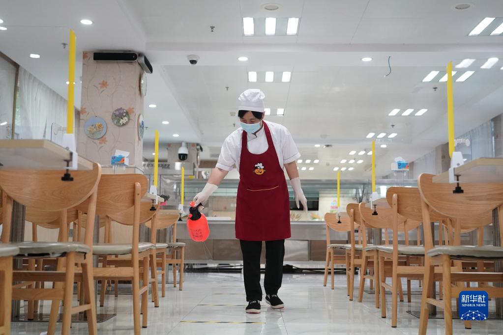 8月29日,海淀區中關(guān)村第一小學(xué)的工作人員在食堂消毒。