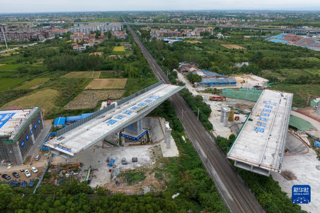 這是8月30日拍攝的湖北孝感兩座萬(wàn)噸橋梁轉體“跨越”京廣鐵路施工場(chǎng)景(無(wú)人機照片)。