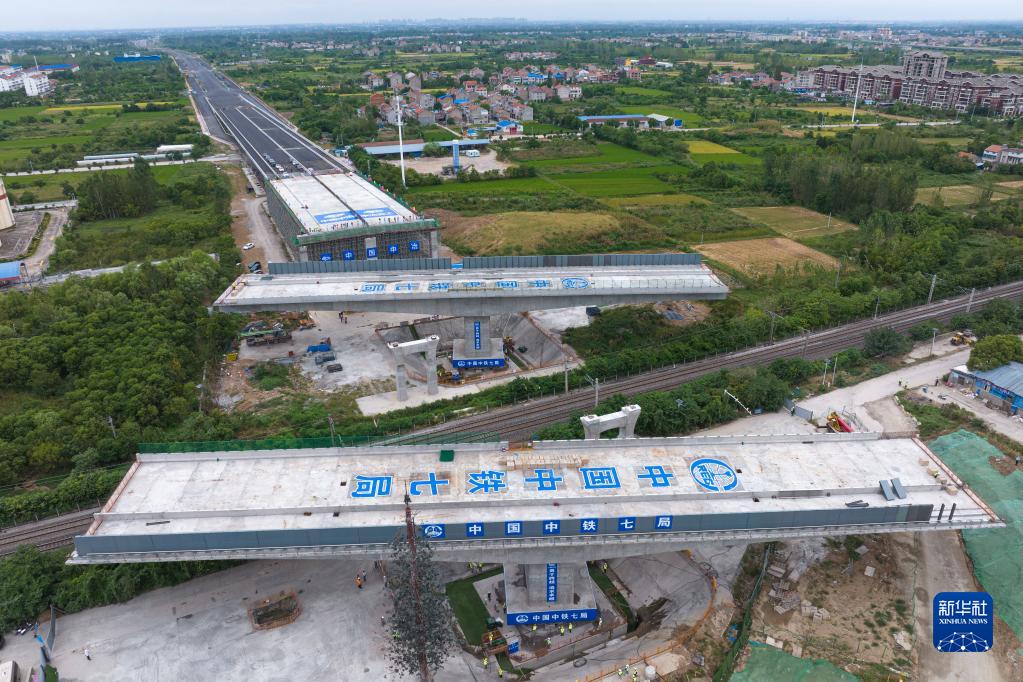 這是8月30日拍攝的湖北孝感兩座萬(wàn)噸橋梁轉體“跨越”京廣鐵路施工場(chǎng)景(無(wú)人機照片)。