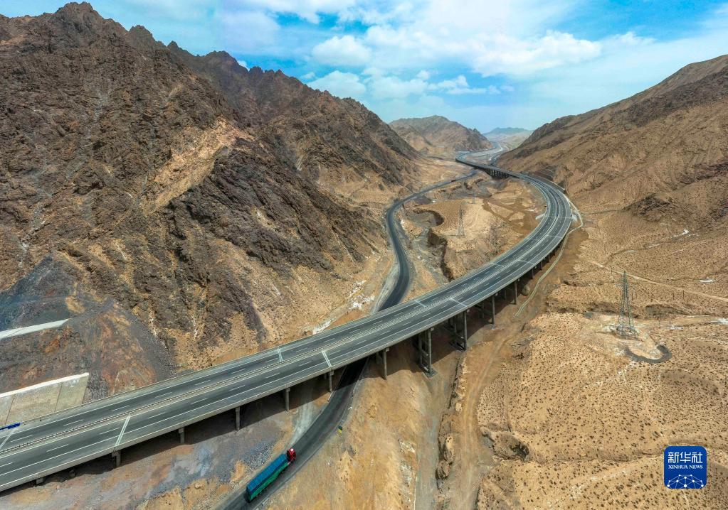 依若高速公路蜿蜒穿越新疆若羌縣山區(5月9日攝,無(wú)人機照片)。