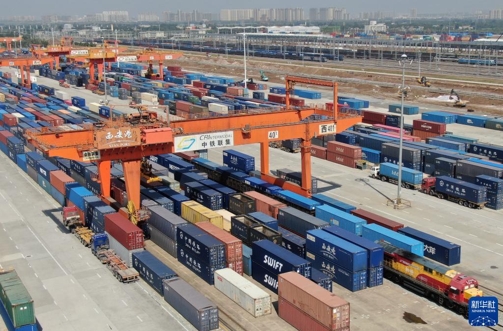 8月31日,滿(mǎn)載土庫曼斯坦甘草中藥材原料的中歐班列回程列車(chē)抵達西安國際港站(無(wú)人機照片)。