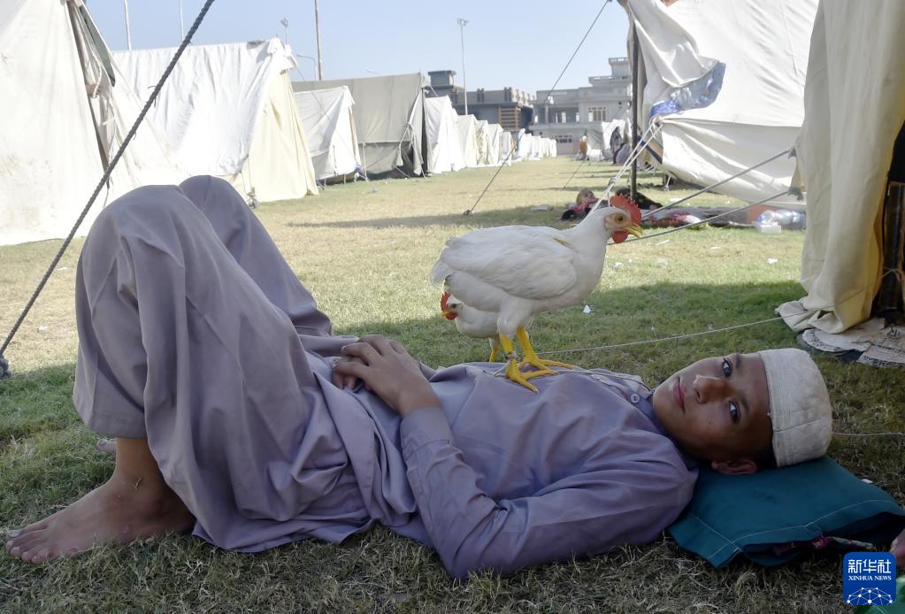 8月31日,在巴基斯坦西北部開(kāi)伯爾-普什圖省的賈爾瑟達地區,一名小男孩在救災帳篷外休息。