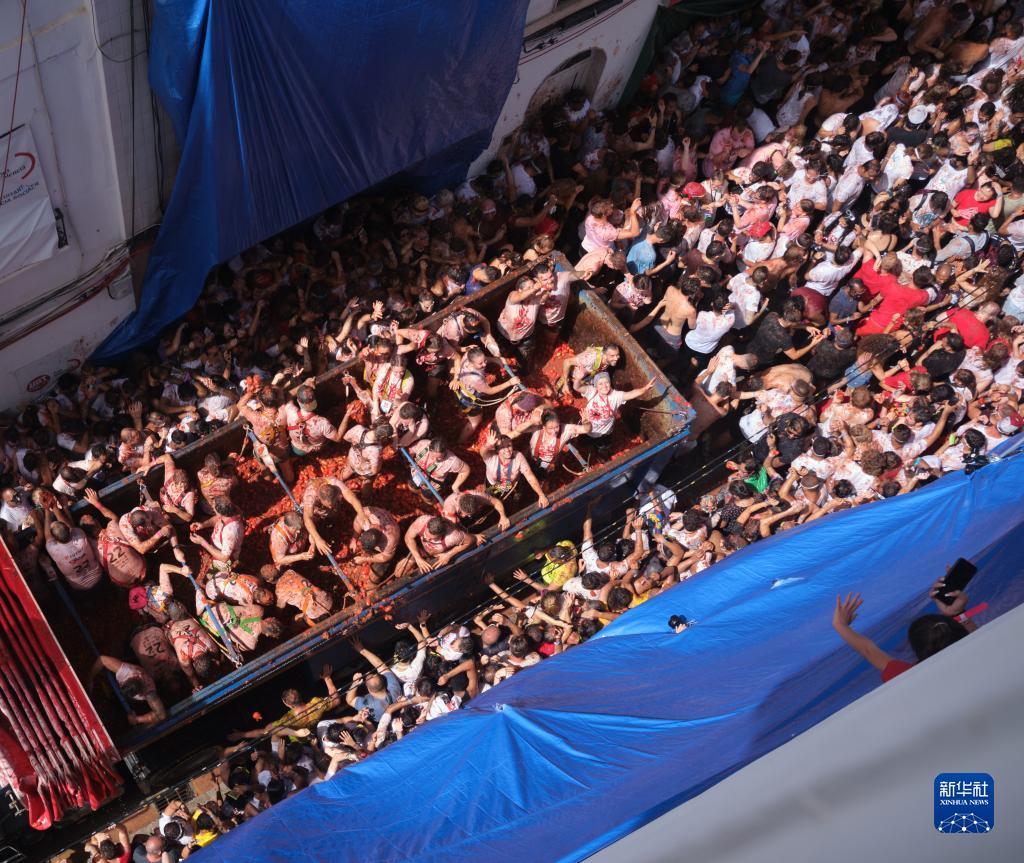 8月31日,在西班牙布尼奧爾舉行的“西紅柿節”上,人們參加“西紅柿大戰”。