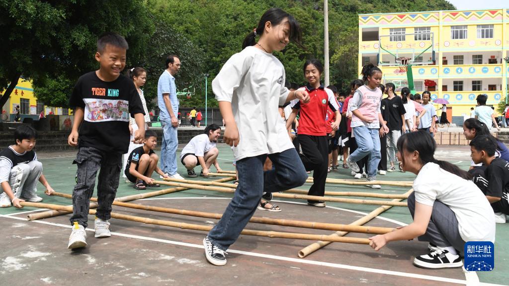 9月1日,廣西大化瑤族自治縣六也鄉六也中心小學(xué)的同學(xué)們在大課間活動(dòng)中跳竹竿舞,歡慶新學(xué)期開(kāi)學(xué)。