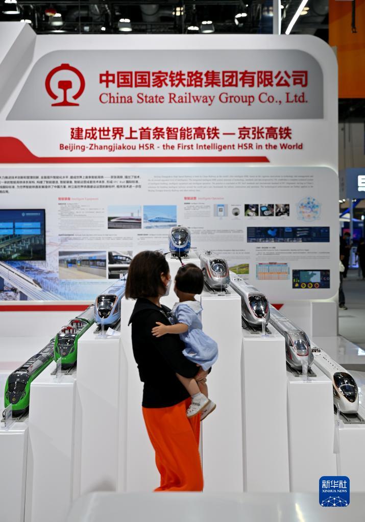 9月1日,觀(guān)眾在國家會(huì )議中心內的國鐵集團展臺觀(guān)看智能動(dòng)車(chē)組模型。