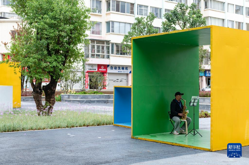 9月1日,市民在昆明廣福小游園內吹薩克斯。