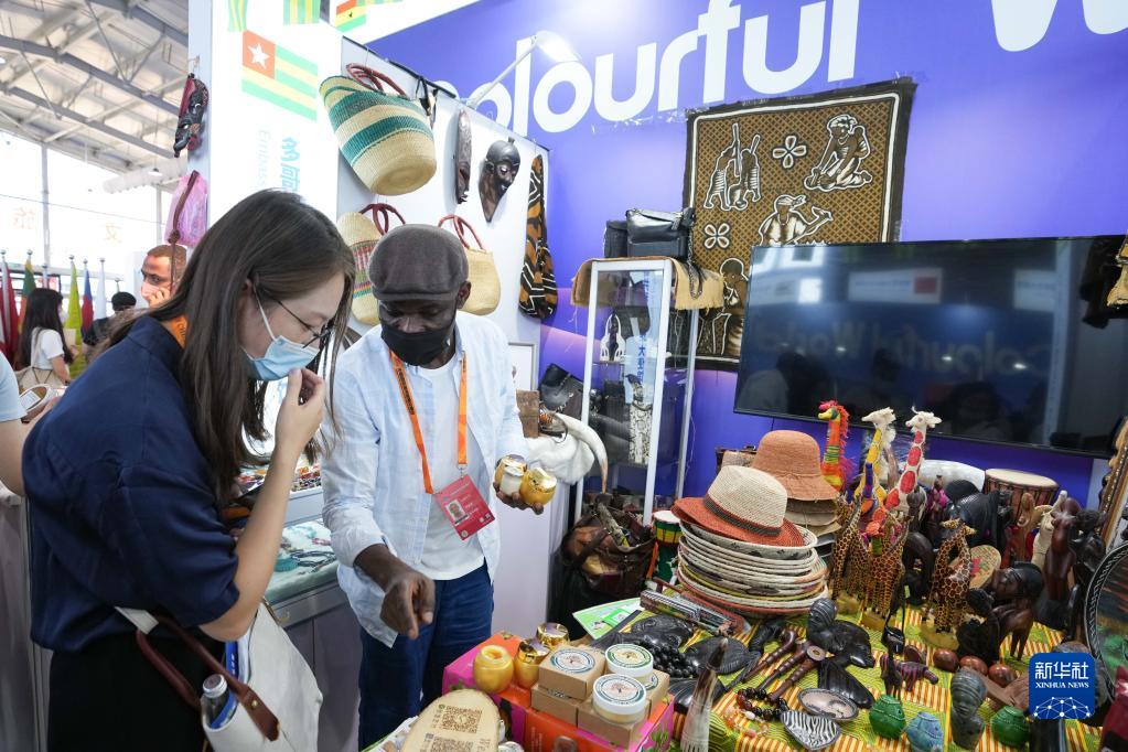 9月1日,在2022年服貿會(huì )首鋼園區,參觀(guān)者(左)在了解展出的多哥共和國商品。