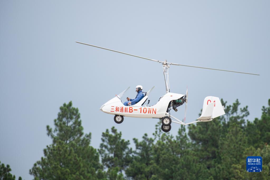 9月1日,在湖南株洲蘆淞機場(chǎng),旋翼機飛行員進(jìn)行飛行表演。