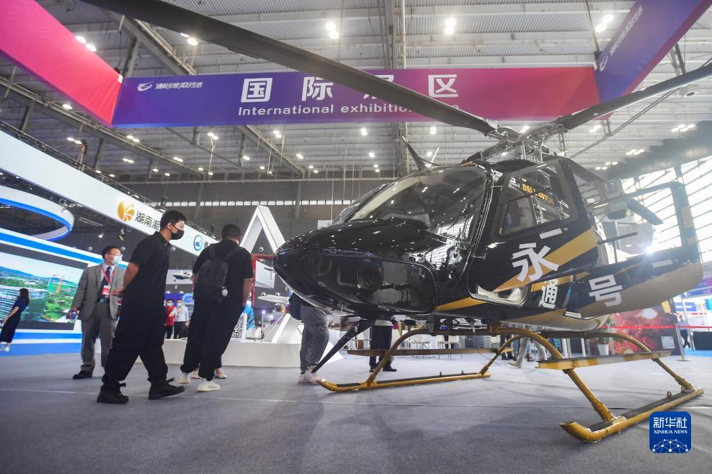這是9月1日在湖南長(cháng)沙國際會(huì )展中心拍攝的博覽會(huì )上的一架直升機。