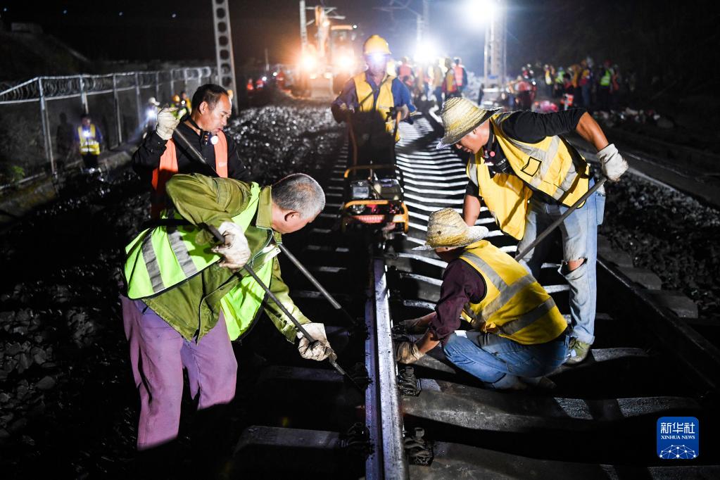 9月1日凌晨,施工人員在重慶鐵路樞紐東環(huán)線(xiàn)磨心坡站作業(yè)。新華社記者 王全超 攝