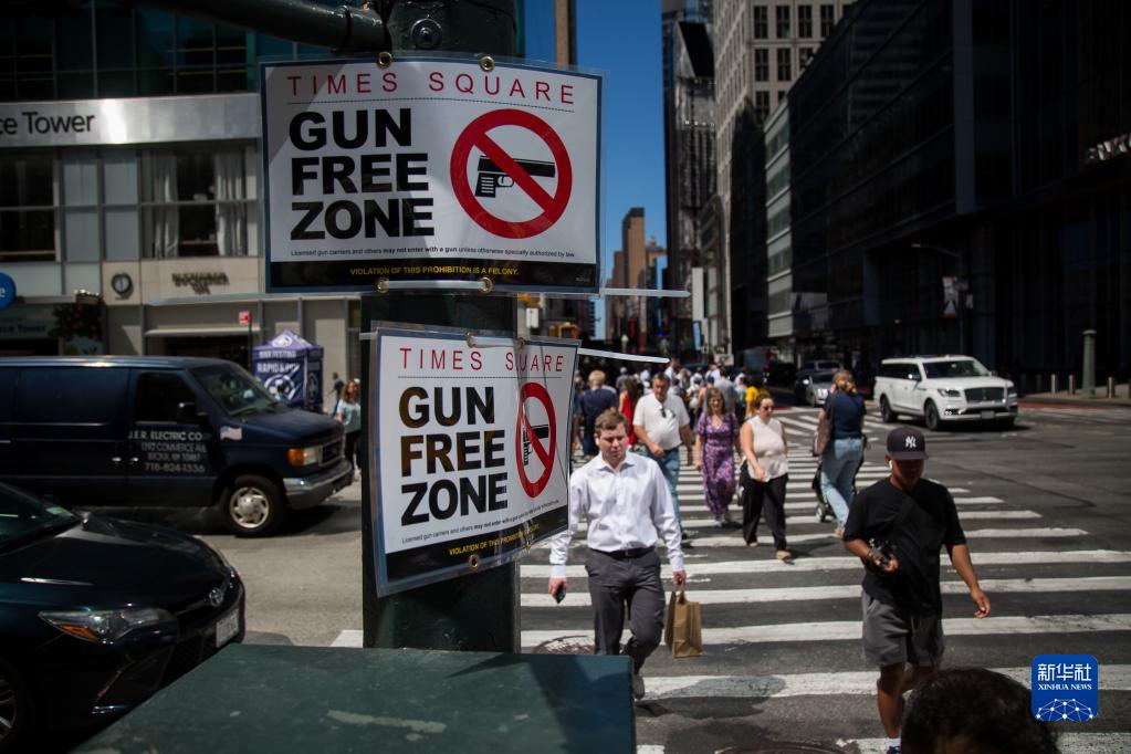 9月1日,人們從美國紐約時(shí)報廣場(chǎng)鄰近街區的“禁槍區”標志牌旁走過(guò)。