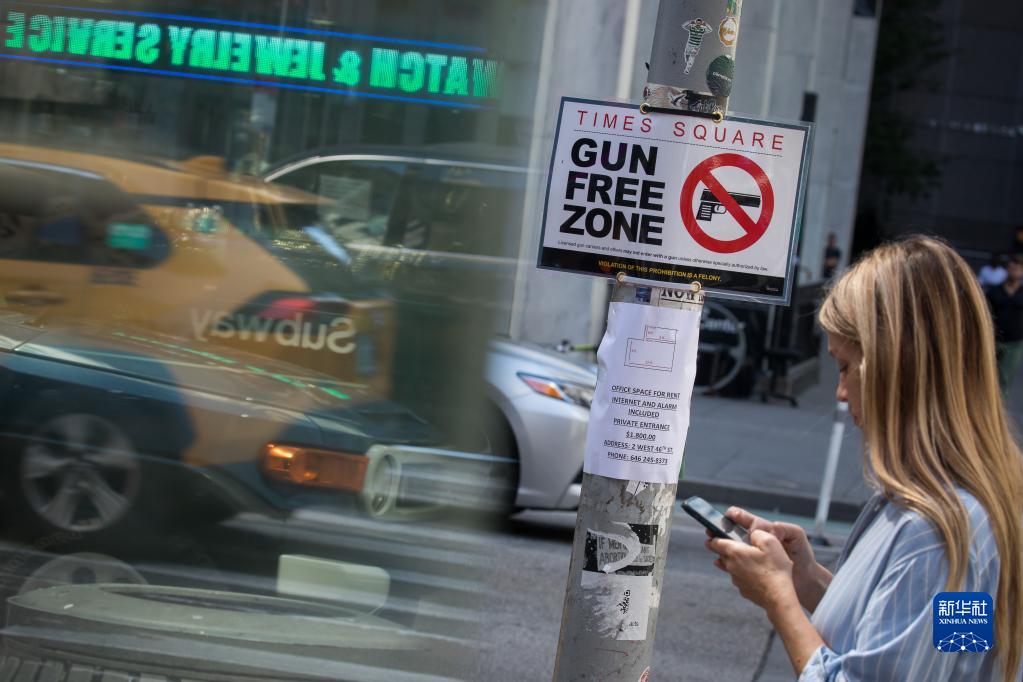 9月1日,人們從美國紐約時(shí)報廣場(chǎng)鄰近街區的“禁槍區”標志牌旁走過(guò)。