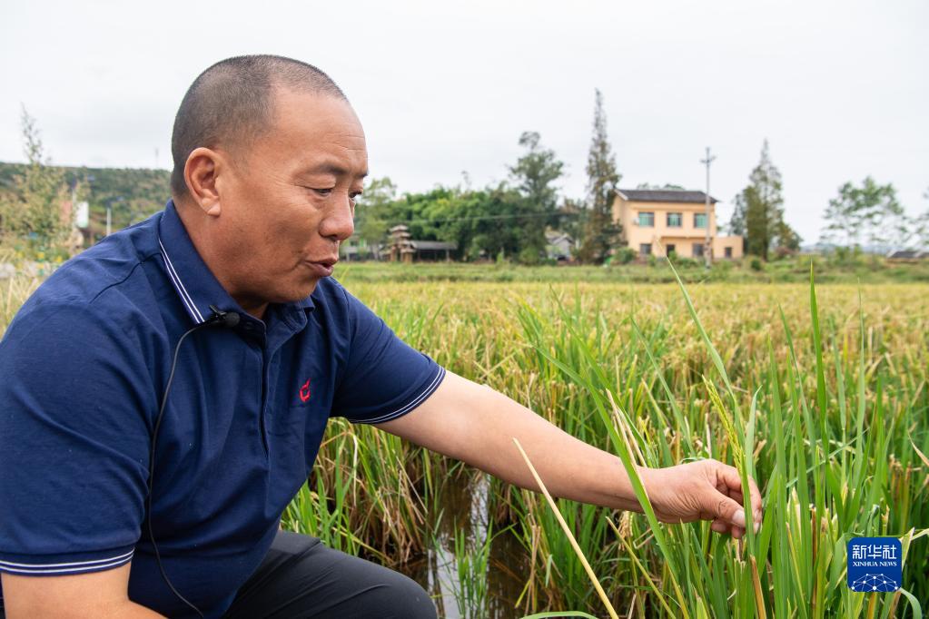 9月1日,在重慶市梁平區安勝鎮,再生稻技術(shù)專(zhuān)家黃華查看再生稻的生長(cháng)情況。