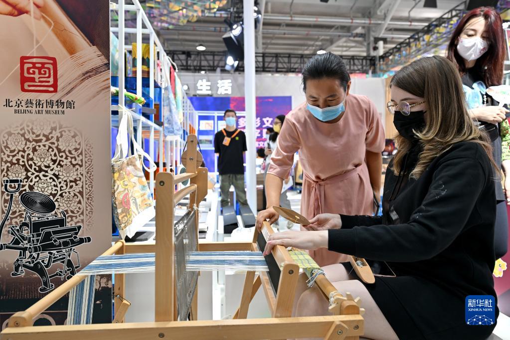 9月2日,一名俄羅斯觀(guān)眾在北京藝術(shù)博物館展臺體驗傳統織布。新華社記者 李鑫 攝