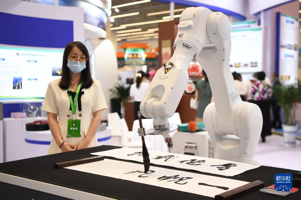 這是9月2日在論壇期間舉辦的湖湘勞模工匠創(chuàng )新成果展上拍攝的機械臂寫(xiě)書(shū)法展示。新華社記者 薛宇舸 攝